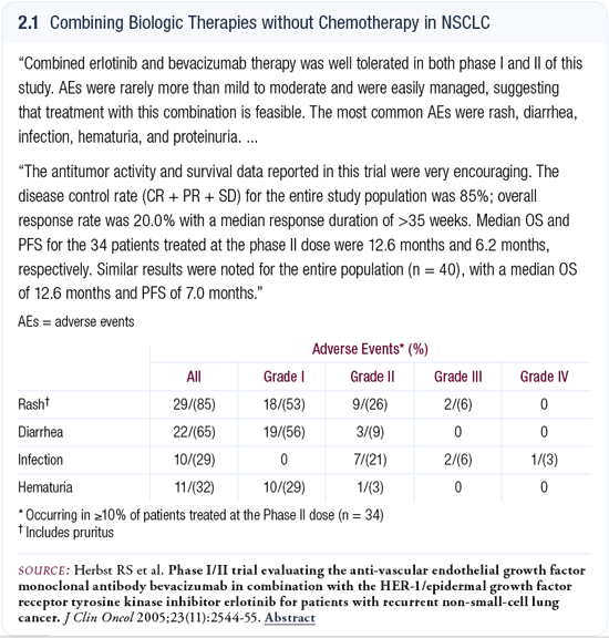 The ECOG study published in the JCO by Roy Herbst and Alan Sandler was very exciting, not just because of the results but because this is a proof of principle (Herbst 2005; [2.1]). They published data from a study evaluating the combination of bevacizumab and erlotinib in previously treated patients with non-small cell lung cancer. The study demonstrated a nice response rate and a median survival that was close to 12 months. Obviously, it’s a selected population and this is not the type of survival rate that we see for all of our patients, but it’s enough to justify taking this regimen ahead, and I believe the erlotinib/bevacizumab will be used in various settings. The idea that two different biologic agents can be combined means we can get away from standard chemotherapy completely and hopefully obtain the results they published. That is exciting.
