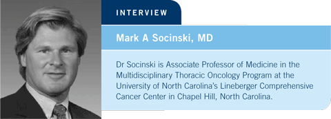 The way I interpret AVAiL is that it’s a second positive trial evaluating the use of bevacizumab in combination with chemotherapy — in this case, cisplatin/ gemcitabine. The regimen appears to be safe, and both the 7.5-mg/kg and the 15-mg/kg doses improved the primary endpoint of progression-free survival (Manegold 2007). No survival data were presented. The 7.5-mg/kg dose did not appear to be less toxic, and I have continued to use 15 mg/kg, based on the survival results from ECOG-E4599 (Sandler 2006). I would bet that at least by ASCO 2008, we will see some survival data from the AVAiL trial, and perhaps that will change our minds about the dosing. For right now, in the absence of survival data in that trial, I’ve continued administering the 15-mg/kg dose. Track 14  DR LOVE: What are your thoughts about the combination of bevacizumab